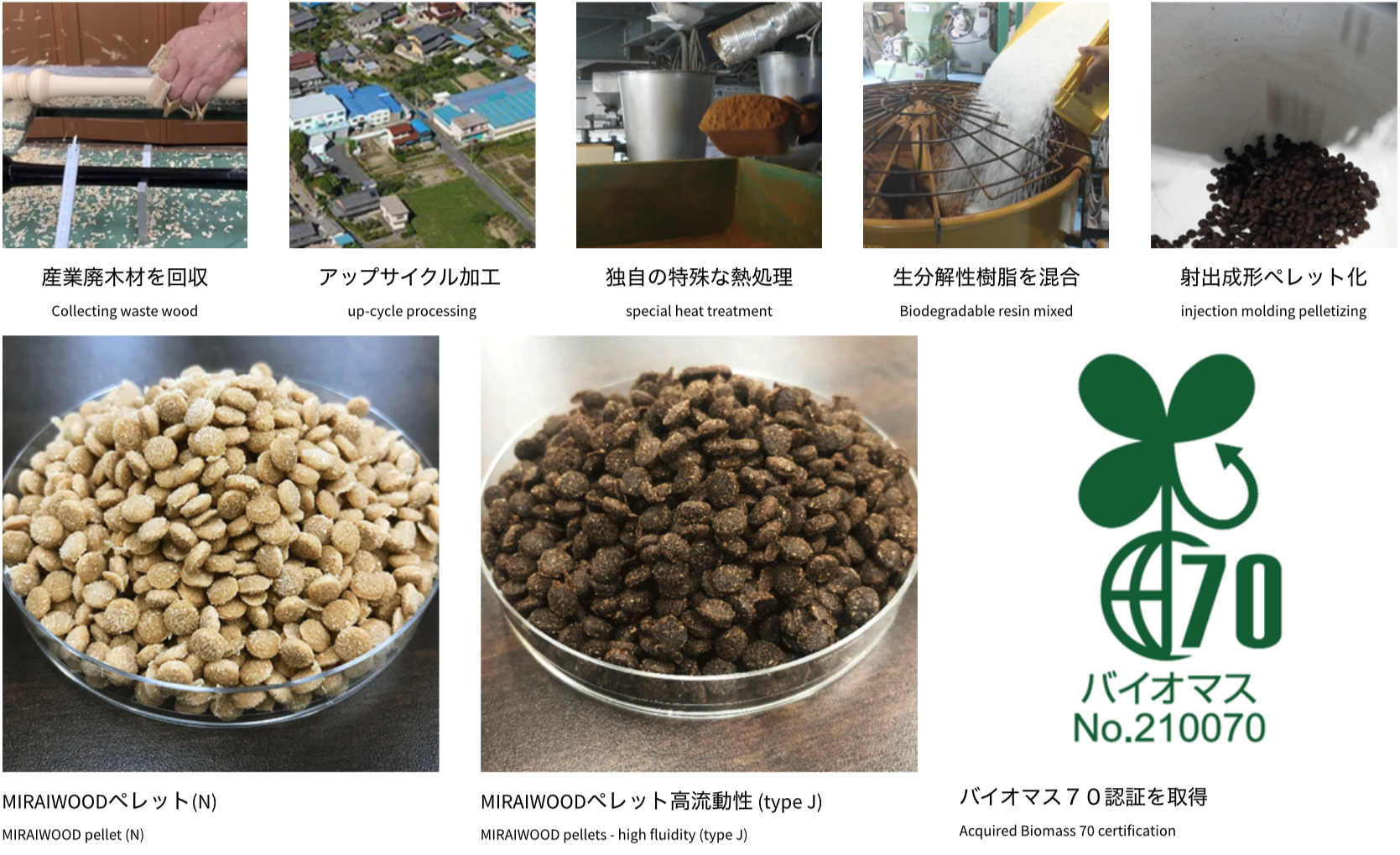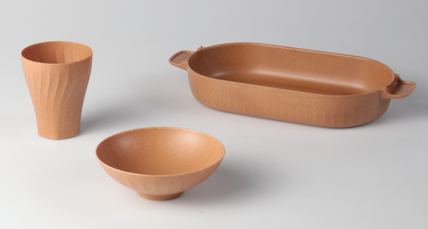 産業から排出される木粉を回収し微粒子化、植物由来の生分解性樹脂を混合することで、量産グレードでも比重73.3%以上の高バイオマス成分にすることに成功。木成分が比重51%以上(体積では80%以上)のため「木製品」に分類することが可能です。