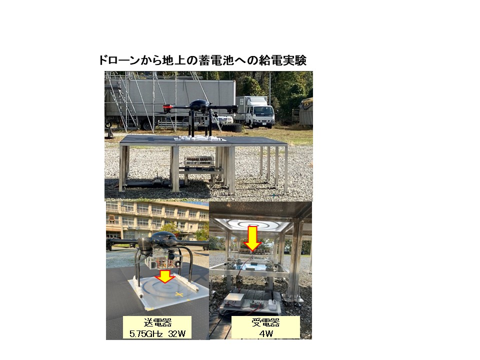 また、ドローンを活用した地上の蓄電池への給電実験を行いました。これは、火山噴火などにより人が立ち入れない場所、危険な場所に設置されたセンサへの給電と、それまで蓄積されているセンサデータの回収を想定しています。
