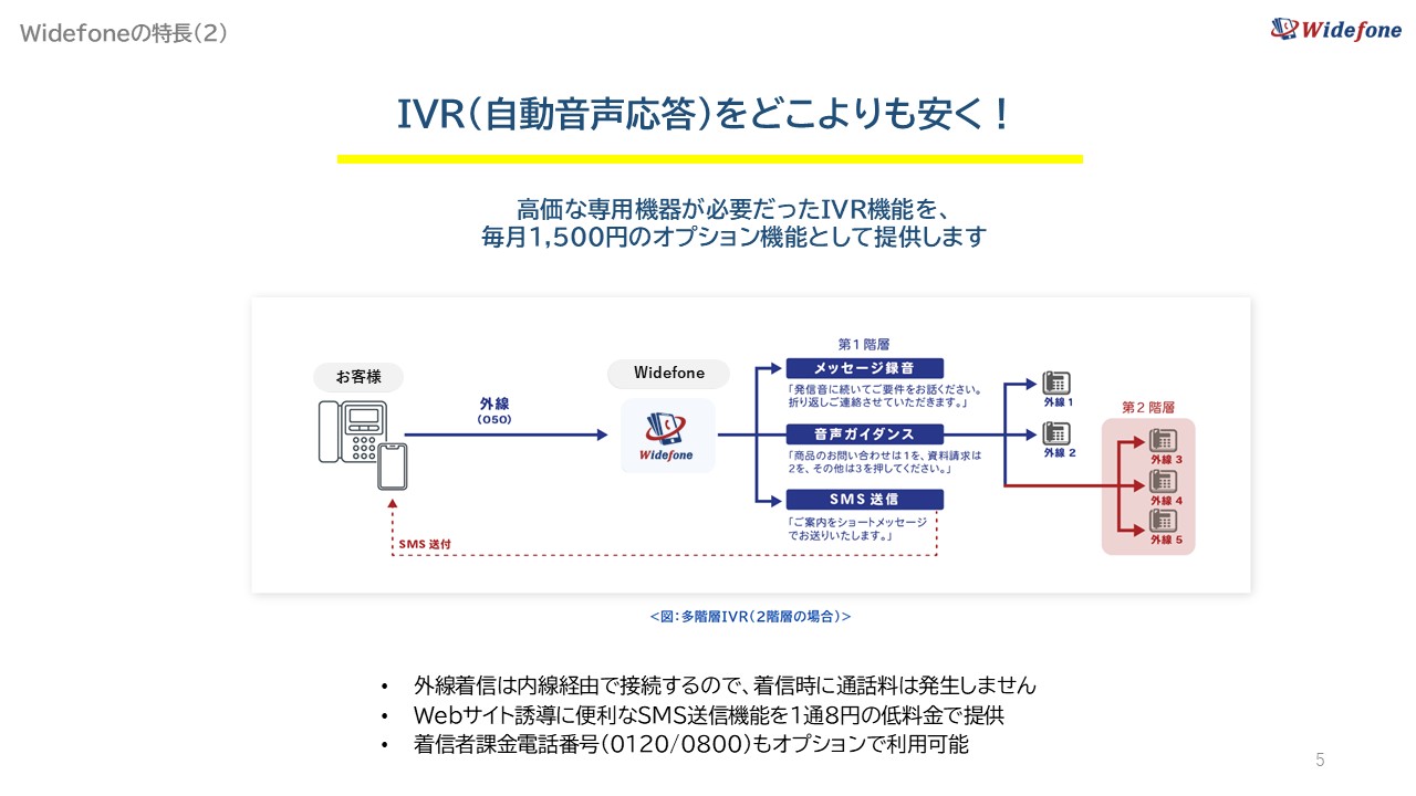 Widefoneは、クラウドPBX(サービス基盤)、スマホアプリ、PCアプリをすべて自社開発しています。スマートフォンの電池消