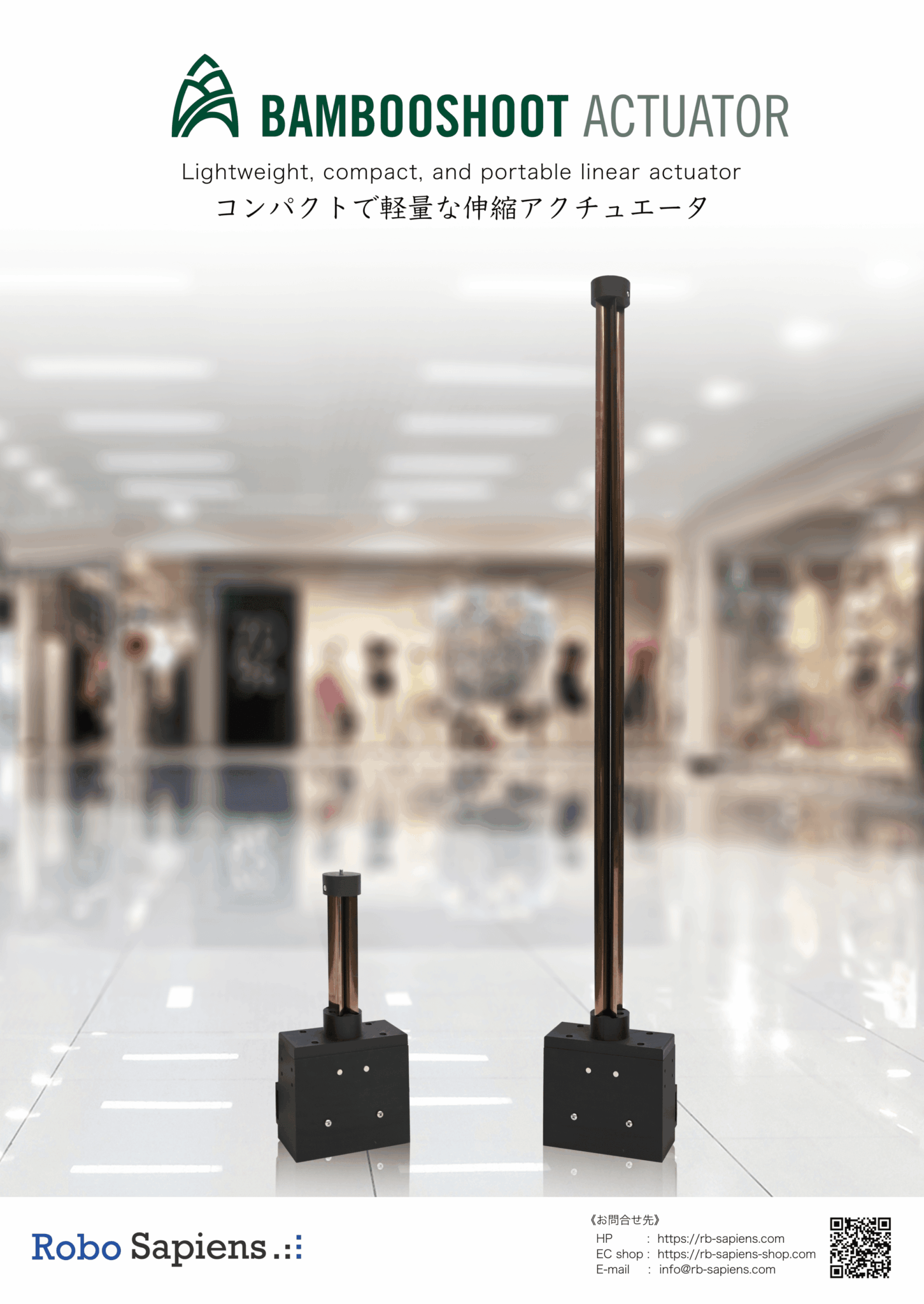 BambooShoot Actuatorは、コンパクトな収納スペースで大きなストロークを可能とする伸縮アクチュエータです。収納時は20cmほどの筐体に収まる小ささで、スイッチひとつで最大4.0mまで伸長することが可能です。